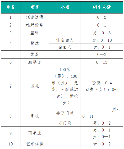 2.按照文化成绩和体育专项成绩3:7的比例进行综合评价,分项目招生计划择优录取。具体公式:综合分=(文化成绩/6)*30%+体育专项成绩*70%;