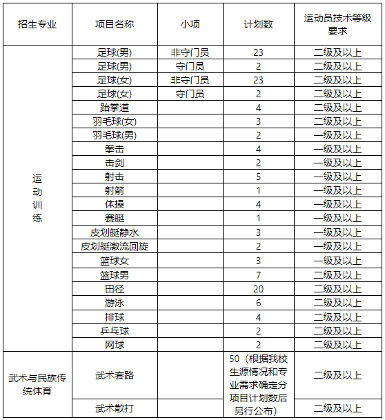 (二)具备我校招生项目的二级(含)运动员及以上技术等级称号,要求具体见“各项目招生计划表”中所列运动员等级要求一栏。考生运动员技术等级以“国家体育总局运动员技术等级系统”公示的数据信息为准。
