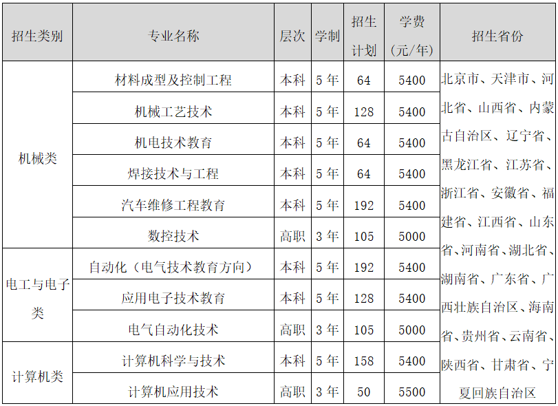 学校除招收高中毕业生外,根据教育部、人力资源和社会保障部有关文件规定,采取单独命题、考试、录取的办法,从中等职业学校(含职业高中、中等专业学校、技工院校)优秀毕业生中招生,为职业教育培养“双证书、一体化”职教师资。单独招生录取的学生与全国普通高考录取的学生享受同等待遇。