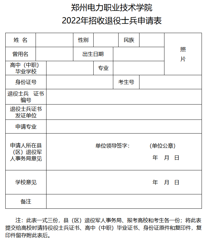 凡参加我校单独考试招生的退役士兵,需于3月28日前登陆郑州电力职业技术学院招生信息网(http://zhaosheng.zzdl.com/)和郑州电力职业技术学院微信公众号下载《郑州电力职业技术学院2022年招收退役士兵申请表》,填报完整后由退役士兵户口所在地退役军人事务局负责审核盖章。考生本人需于4月1日前携带身份证、退役证书、《郑州电力职业技术学院2022年招收退役士兵申请表》送达我校招生办公室。考生本人须对申请资格真实性负责,对虚假材料获取相应资格的,一经查实,将依据相关规定,取消其当年报名、考试和录取资格。按照国家相关规定,退役士兵报考我校免文化素质考试,只参加职业适应性测试,单招录取的退役士兵须将档案转至我校并参加全日制培养。