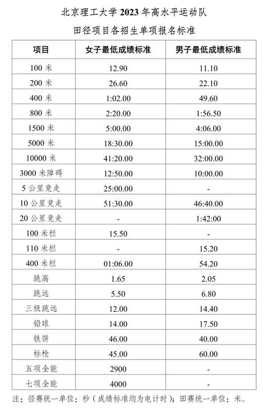 注:报考我校田径项目的考生报名提供的参赛成绩需达到我校田径项目报名标准(见下表);报名时,田径项目的考生必须明确填报小项,男子足球项目的考生必须明确填报场上位置,武术项目的考生必须明确填报测试套路分项。